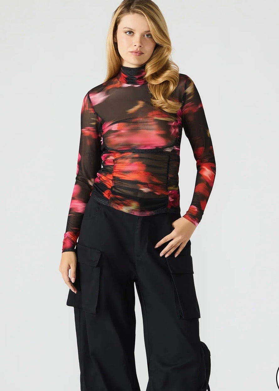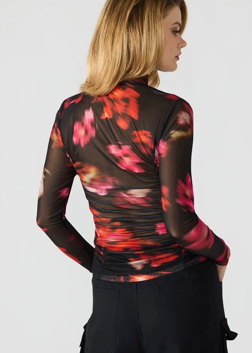 The Taylore Floral Blouse features a long-sleeved, mock neck design crafted from breathable mesh fabric