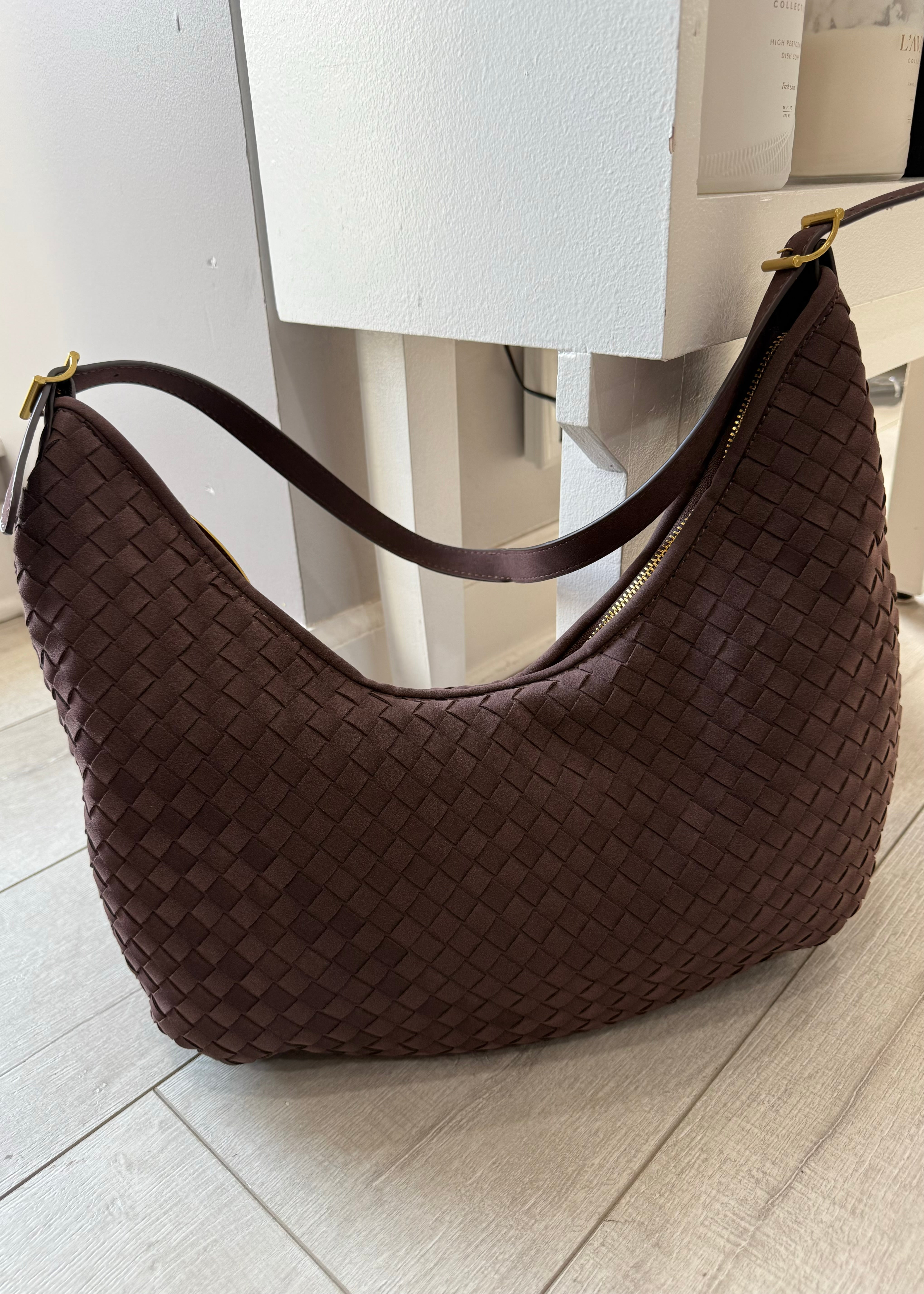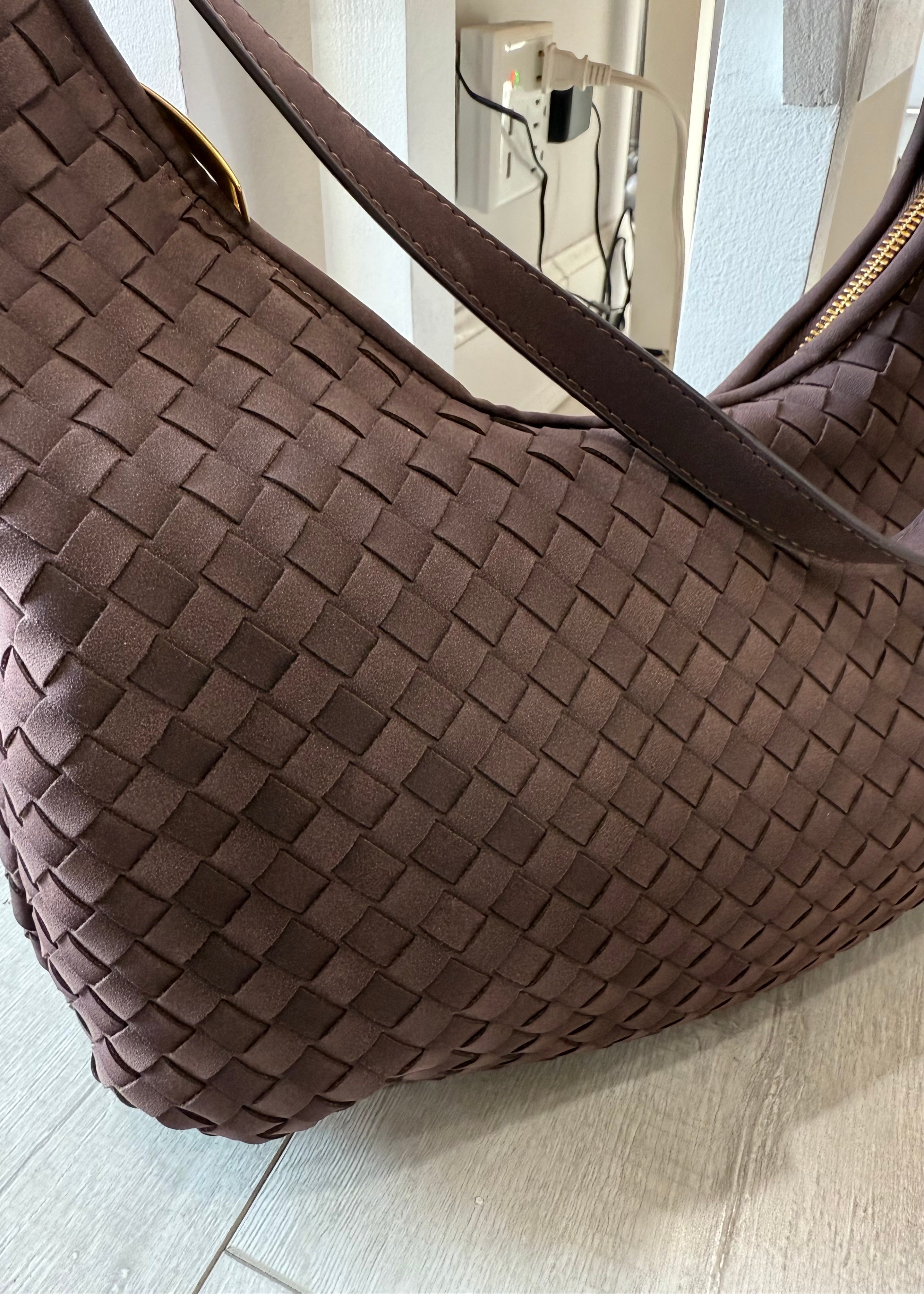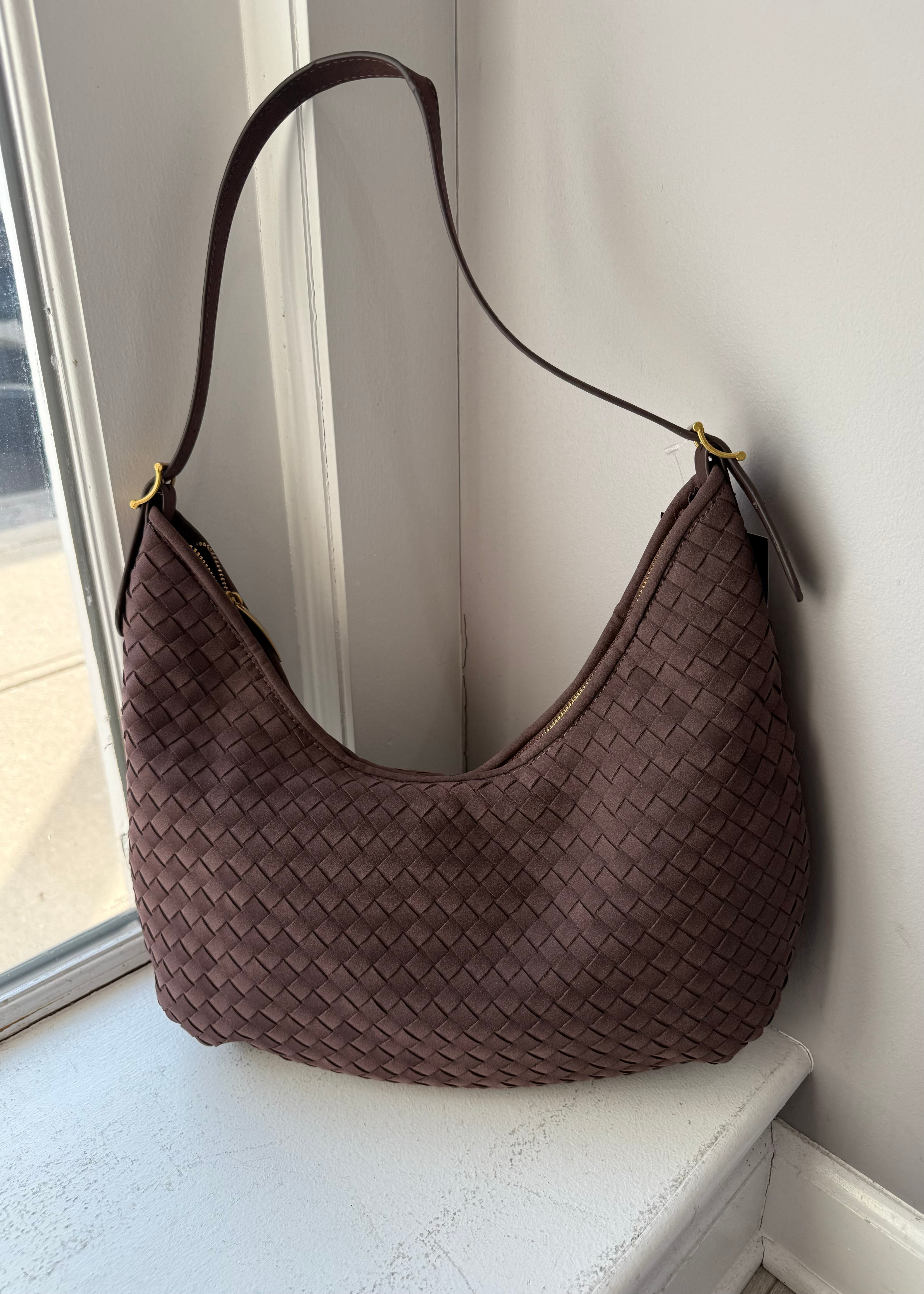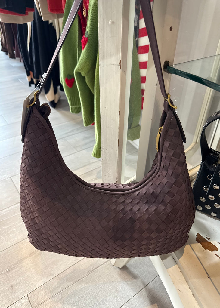 Made from vegan leather, this bag features a woven design in a classic dark brown color