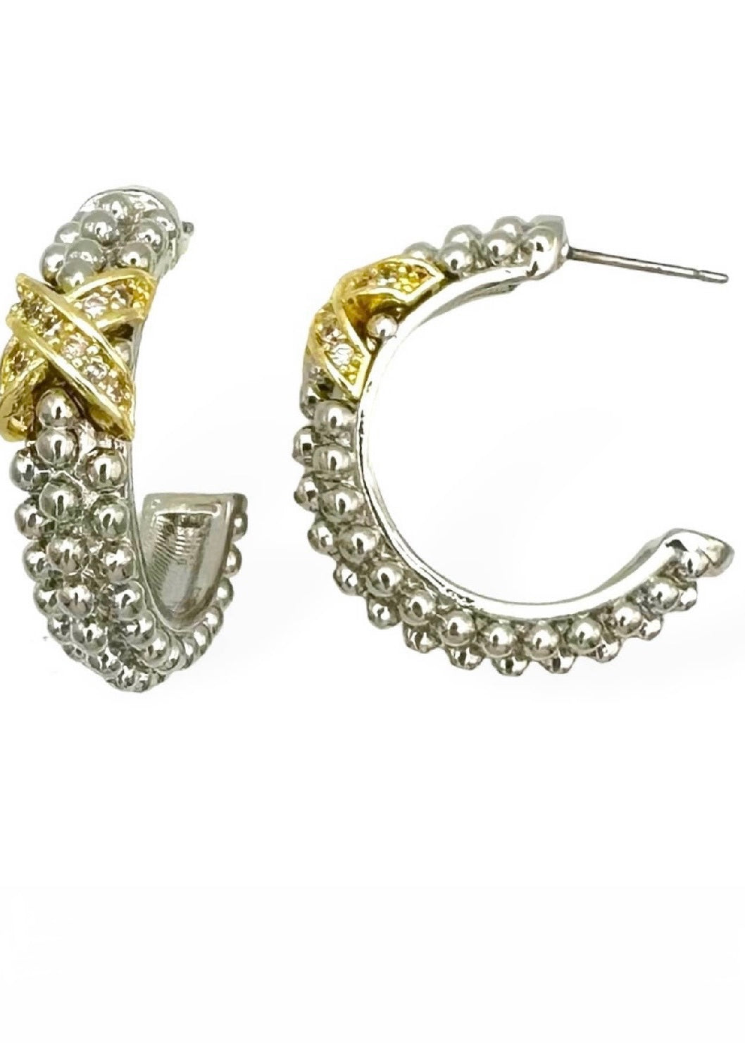 Enhance your style with our Two Tone X Station Earrings. Featuring a classic textured hoop design, these earrings are adorned with beautiful gold and crystal X stations. Elevate any outfit with this elegant and eye-catching accessory.