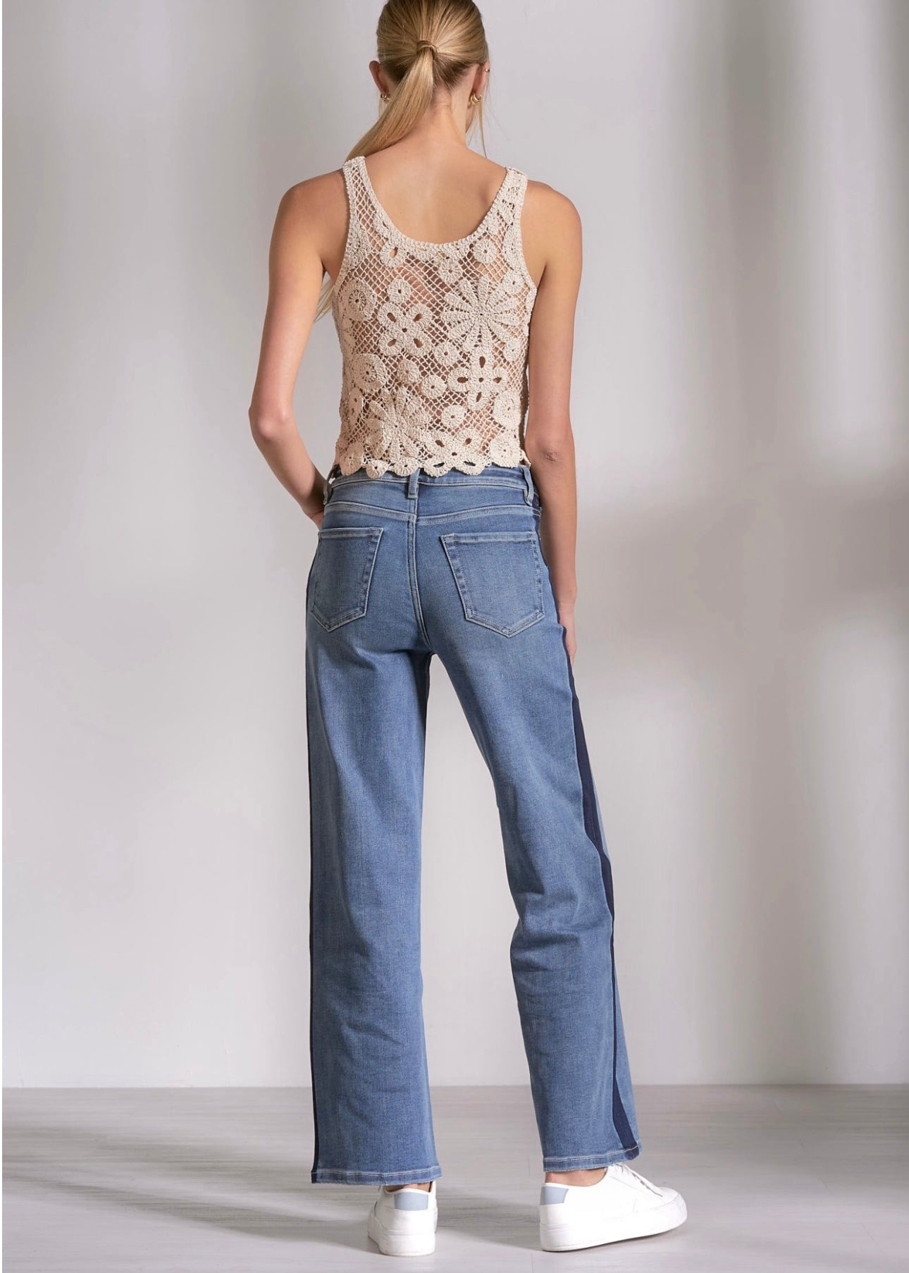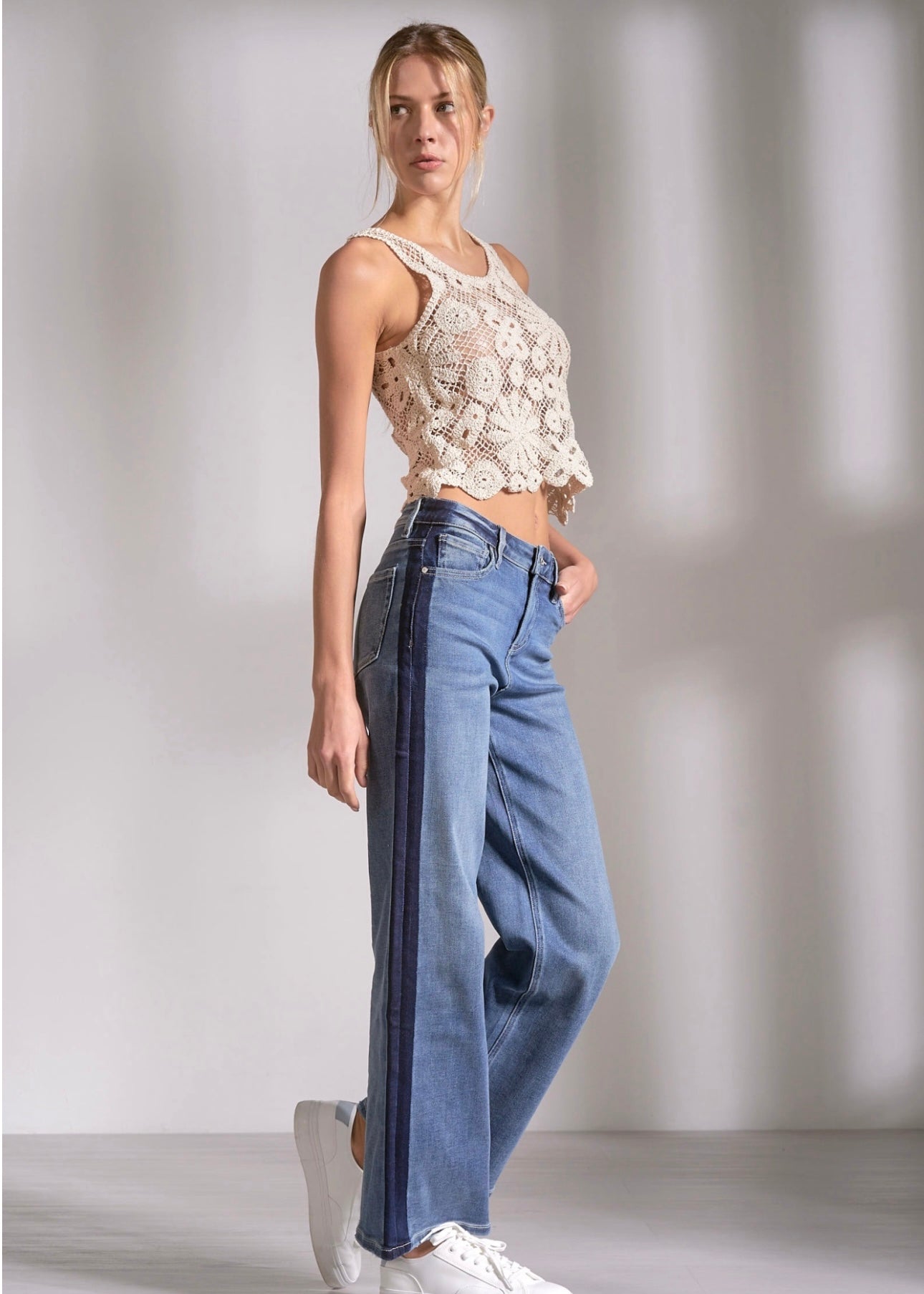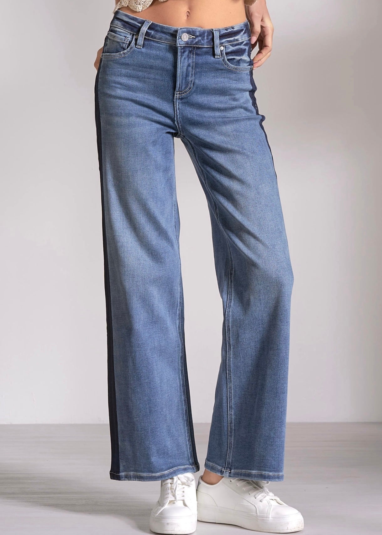 Jade Jeans are crafted from medium washed denim that offers stretch and softness, enhancing comfort during wear. The design includes dark contrast striping along the sides, which adds a stylish touch. These jeans run true to size, ensuring a reliable fit for various body types.